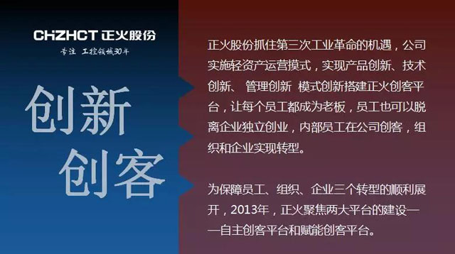 正火股份抓住第三次工业革命的机遇,公司实施轻资产运营摸式,实现产品创新、技术创新、 管理创新、模式创新、搭建正火创客平台,让每个员工都成为老板,员工也可以脱离企业独立创业,内部员工在公司创客,组织和企业实现转型。为保障员工、组织、企业三个转型的顺利展开,2013年,正火聚焦两大平台的建设——自主创客平台和赋能创客平台。